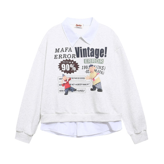 Retro Fun Cartoon Print Spliced Mock Two-Piece Polo Neck Sweatshirt Unisex Casual Top
